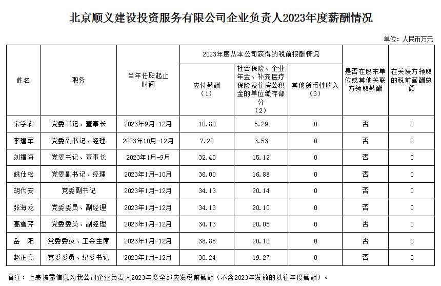 北京順義建設(shè)投資服務(wù)有限公司企業(yè)負(fù)責(zé)人2023年度薪酬信息披露