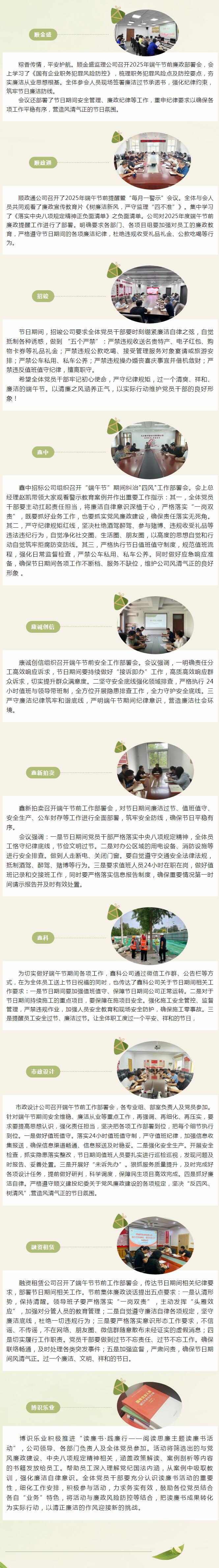 端午佳節(jié)至,清風(fēng)正氣存。值此傳統(tǒng)節(jié)日來臨之際,為深入貫徹落實(shí)中央八項(xiàng)規(guī)定精神,持之以恒糾 “四風(fēng)”,嚴(yán)防 “節(jié)日病”,順義建投各子企業(yè)黨支部開展“端午節(jié)”廉政提醒暨“每月一警示”會(huì)議,為全體黨員干部敲響廉潔警鐘,確保節(jié)日期間風(fēng)清氣正。