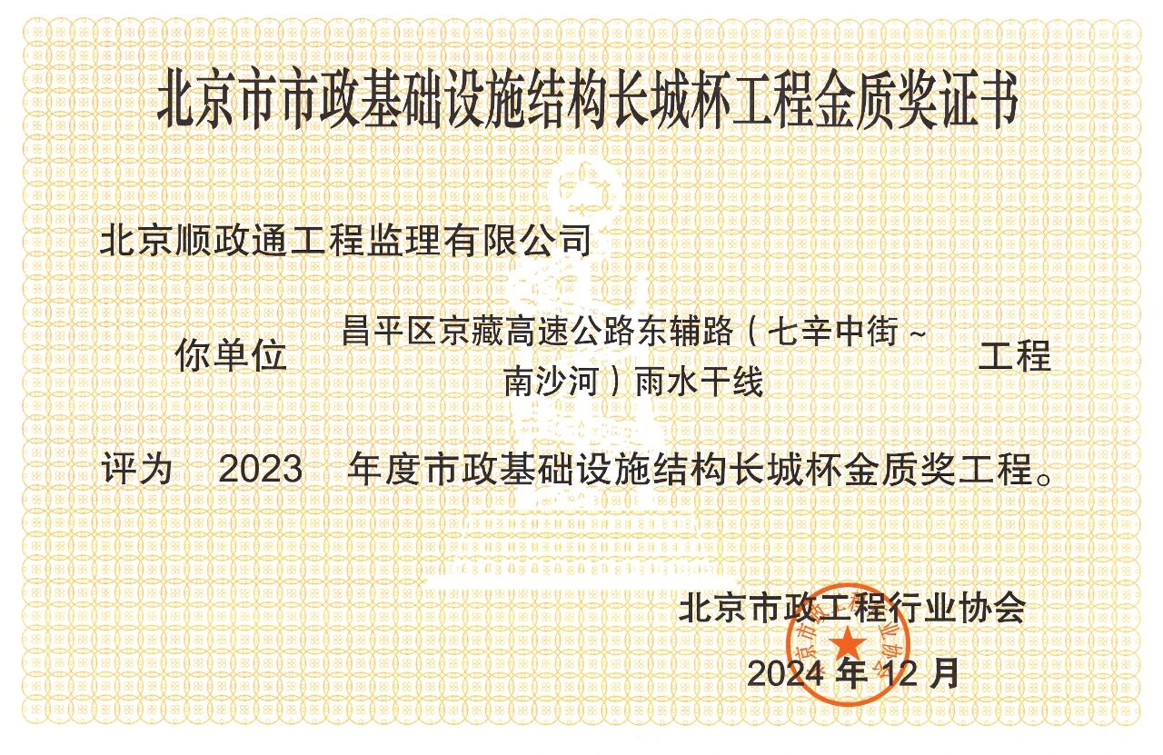 順政通監(jiān)理公司喜獲北京市市政基礎(chǔ)設(shè)施工程結(jié)構(gòu)長城杯金質(zhì)獎(jiǎng)