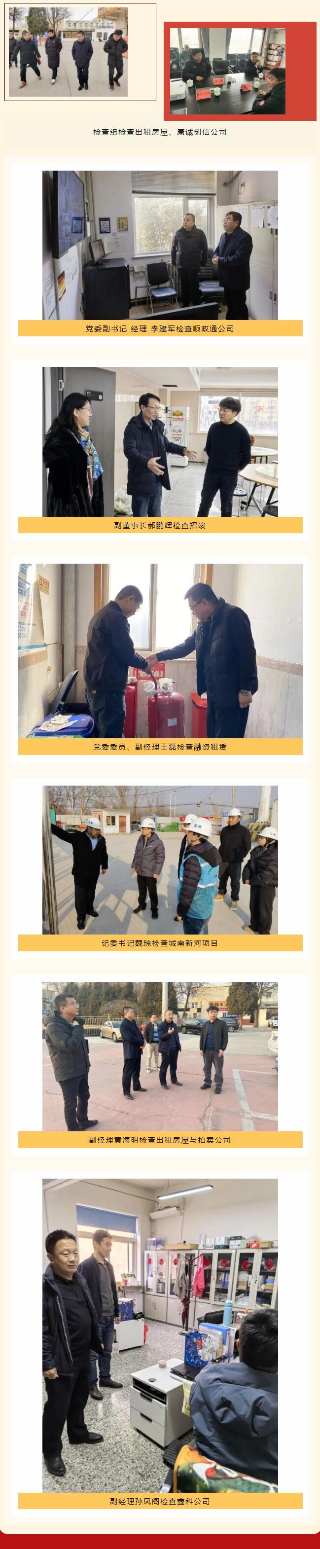 為切實(shí)做好春節(jié)期間服務(wù)保障工作,確保節(jié)前重點(diǎn)工作部署會(huì)各項(xiàng)工作要求落實(shí)到位,按照《重要時(shí)期安全服務(wù)保障方案》安排,順義建投領(lǐng)導(dǎo)班子成員帶隊(duì)對(duì)下屬子企業(yè)開展督導(dǎo)檢查,確保春節(jié)期間企業(yè)安全穩(wěn)定。1月23日——1月26日,公司領(lǐng)導(dǎo)班子采取分片包干形式,對(duì)下屬企業(yè)的辦公區(qū)域、監(jiān)理項(xiàng)目、出租房屋等進(jìn)行詳細(xì)檢查,對(duì)發(fā)現(xiàn)的問題,要求認(rèn)真整改,確保落實(shí)到位。