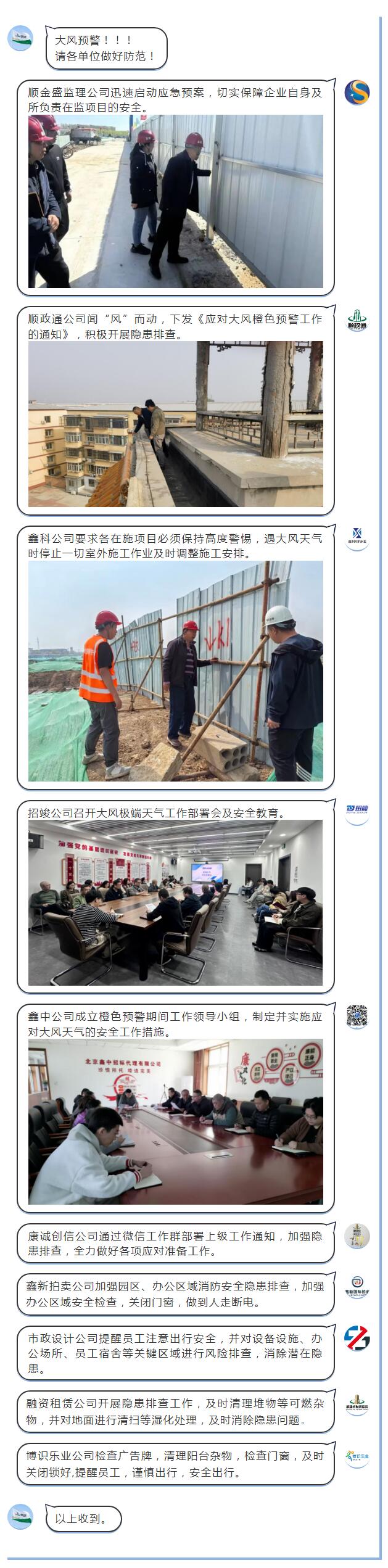 4月10日,區(qū)氣象臺(tái)發(fā)布大風(fēng)橙色預(yù)警,預(yù)計(jì)11日20時(shí)后陣風(fēng)高達(dá)8、9級(jí),12日6時(shí)至22時(shí)平均風(fēng)速達(dá)6級(jí),陣風(fēng)9~11級(jí),并伴有沙塵和強(qiáng)降溫天氣。面對(duì)極端大風(fēng)天氣的嚴(yán)峻挑戰(zhàn),順義建投下屬各單位,以高效的行動(dòng)和全面的舉措,切實(shí)保障監(jiān)理和管理的在施項(xiàng)目和辦公場(chǎng)所安全。